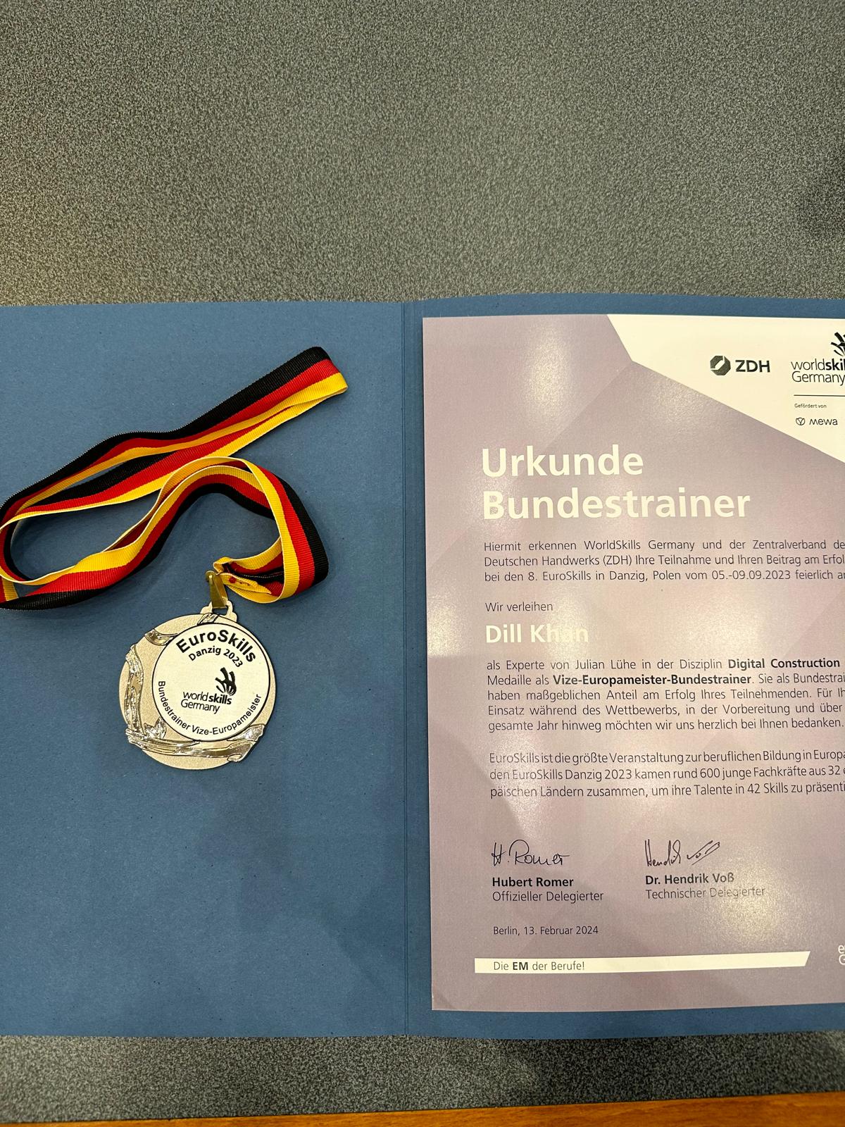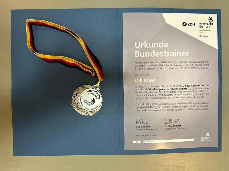 Für die Disziplin Digital Construction ist die Ehrung eng mit dem sportlichen Erfolg in Danzig verbunden. Deutschland gewinnt hier die Silbermedaille durch Julian Lühe, der sich den Titel Vize-Europameister sichert. Die Bundestrainer-Urkunde unterstreicht die Bedeutung der Trainerarbeit im Hintergrund, die diesen Erfolg ermöglicht hat – von der fachlichen Ausrichtung über methodische Standards bis hin zur mentalen Vorbereitung.